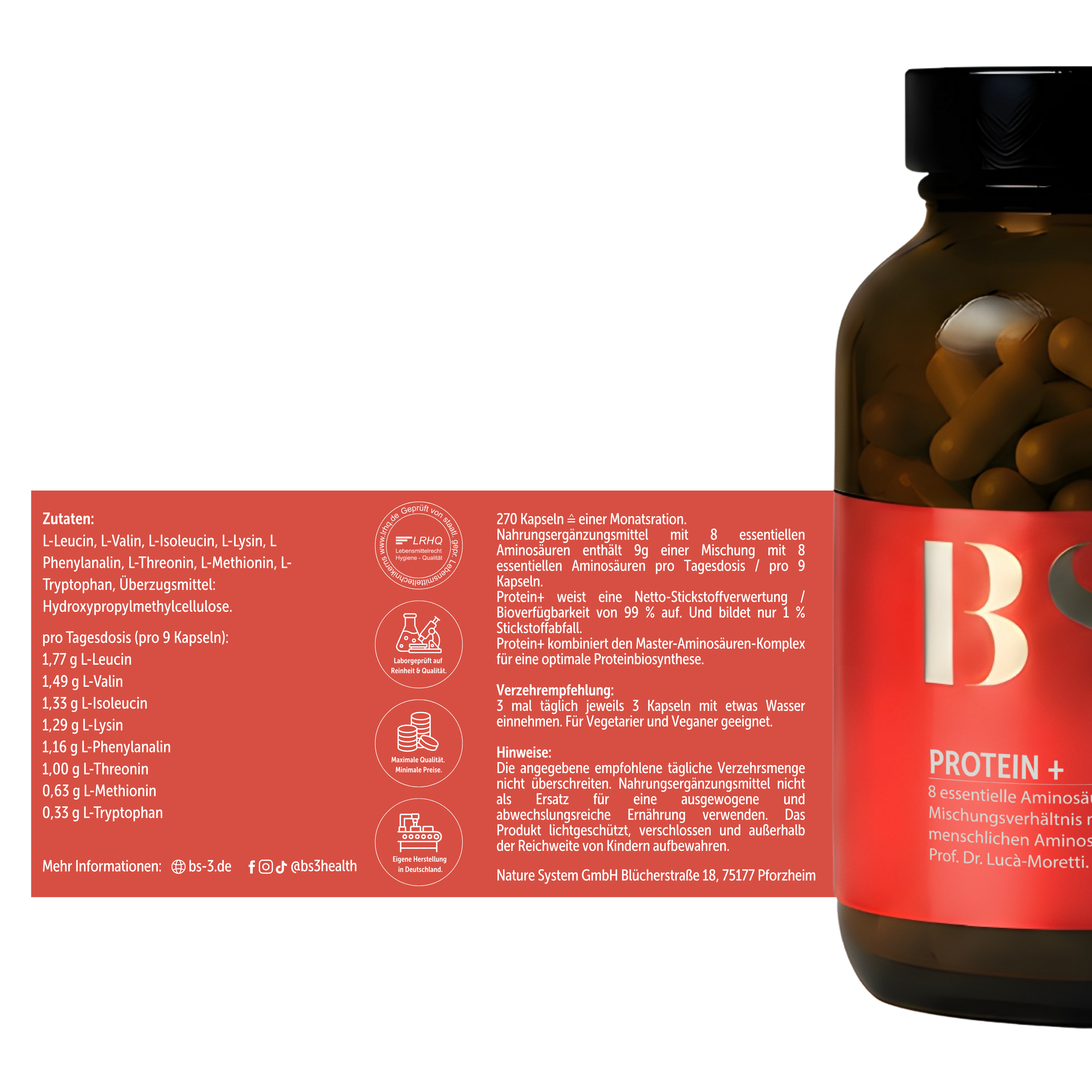 Protein+ sind Kapseln mit essentiellen Aminosäuren im optimalen Mischverhältnis nach Prof. Dr. Lucà-Moretti. Sie liefern dem Körper gezielt genau die Bausteine, die er täglich benötigt, unabhängig von Mahlzeiten oder Proteinmengen.
